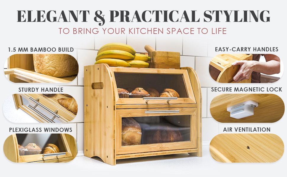 Amazon Com Arise Stylish Bamboo Bread Box For Kitchen Countertop Extra Large 2 Shelf Wooden Bread Storage With Clear Windows And Air Vents Keeps Bread Bagels And Rolls Fresh 15 7 X 10 4 X 14 4 Self